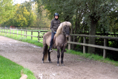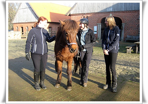Takana on myös ihana reissu Saksaan, Lindenhofiin valmentajamme Andreas Trappen luo. Torstai-iltana Sanna haki meidät lentokentältä ja yövyimme Billerbeckissä. Perjantaiaamuna suuntasimme heti Lindenhofiin. Ensimmäiseksi tietenkin halusimme nähdä Gullbrán, tammamme, joka oli alkusyksystä muuttanut Islannista Andreaksen luo. Gullbrá on kantavana oriista Lukku-Láki frá Stóra-Vatnsskarði, josta Andreas omistaa osan. Lukku-Láki on Àlfur frá Selfossin jälkeläinen ja odotammekin innolla millainen varsa tästä yhdistelmästä tulee. Loppupäivän ratsastimme hevosia ja lisää hevosia. Saimme Andreakselta vapaat kädet ratsastamisen suhteen ja se luottamus tuntui hyvältä. Andreaksella olikin helppo päivä, jonka hän vietti kahviossa, koska ratsastimme hänen treenihevosensa.